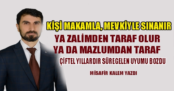 Ali Çiftel yıllardır süregelen uyumu bozdu Kişi makamla, mevkiyle sınanır; ya aldanır yahut elinin tersiyle itmesini bilir. Makam kişinin hakikatini ortaya çıkarır. Kişi haksızlık karşısındaki tavrıyla sınanır; ya zalimden taraf olur ya da mazlumdan taraf. Hakkı savunur ya da haksıza yandaş olur ve ayarı ortaya çıkar. Yine kişi menfaatle sınanır; dünya malı, para, mülk neyse. Ya tamah eder peyda olur ve yahut şahsiyetini satın alamaz kimse. Şahsiyeti ortaya çıkar. Hepimiz aslında sınanıyoruz zaman zaman, makamla, menfaatle, hakla, adaletle. İşte zihniyetimiz neyse, ayarımız ne kadarsa ortaya çıkıyor o vakit. İnançlı insanlarız çoğumuz; işte bu sınanmalar uhrevi akıbetimizi de belirliyor. Ya cehenneme bilet alıyoruz ya da cennete yüzümüz oluyor.